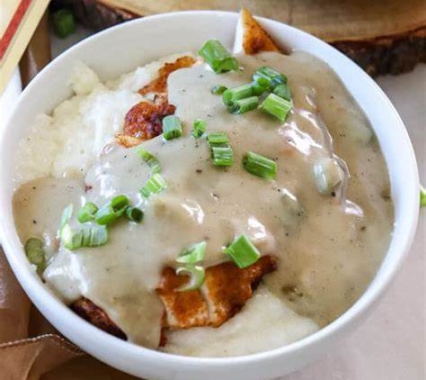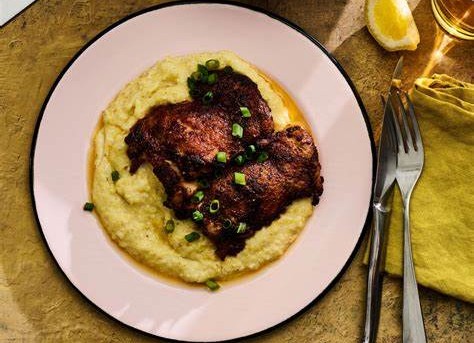 - 把煮好的玉米糊盛到四个盘子里,再把烤好的鸡肉放在上面,撒上切好的葱。吃的时候可以根据自己喜好,挤点柠檬角的汁,要是喜欢吃辣,也能配上点辣酱,味道超赞!