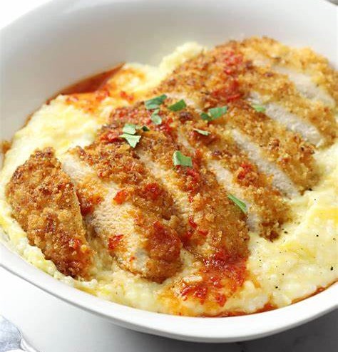 - 把烤箱中层的烤架位置调好,预热到 200°C,拿一个中等大小的锅倒入牛奶和 480 毫升水,大火烧开,接着转成中低火,加入玉米粉,边煮边搅拌,大概 15 – 20 分钟,煮到玉米糊浓稠、顺滑又软糯。然后加入黄油和奶酪,再根据自己口味加盐和黑胡椒调味,盖上锅盖放一边备用。
