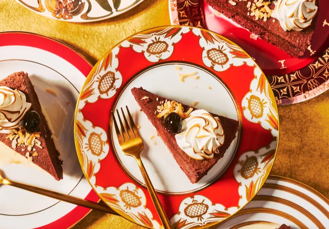 11、将蛋糕从模具倒扣在盘子上,把蛋白霜装入裱花袋,按喜好挤在蛋糕顶部,用喷枪将蛋白霜烤至金黄色,撒上烤椰丝,按个人喜好放上樱桃或红樱桃片,美味的蛋糕就完成啦。