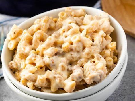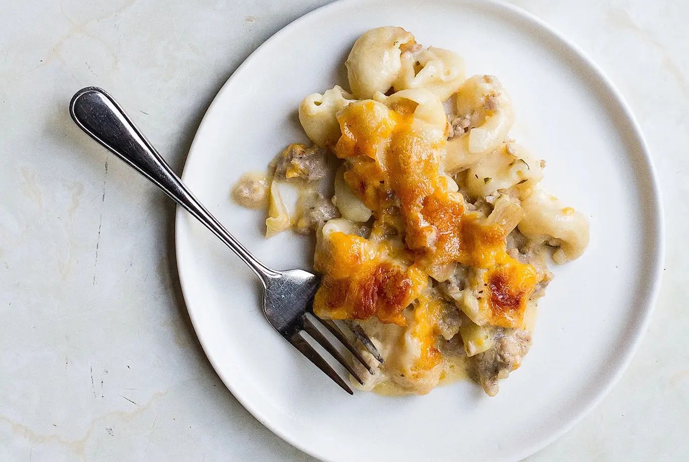 2、取大锅放在炉灶上开中大火,融化黄油。泡沫消退后,加洋葱炒 2 分钟,放入去肠衣的香肠,用木勺搅散成小块,炒至棕色。加苹果块和紫苏叶炒 5 分钟,再加面粉炒 2 分钟。然后倒入苹果酒、牛奶,不时搅拌,煮至酱汁浓稠。放入一半奶酪丝,依口味加盐和黑胡椒调味,搅拌至奶酪融化。
