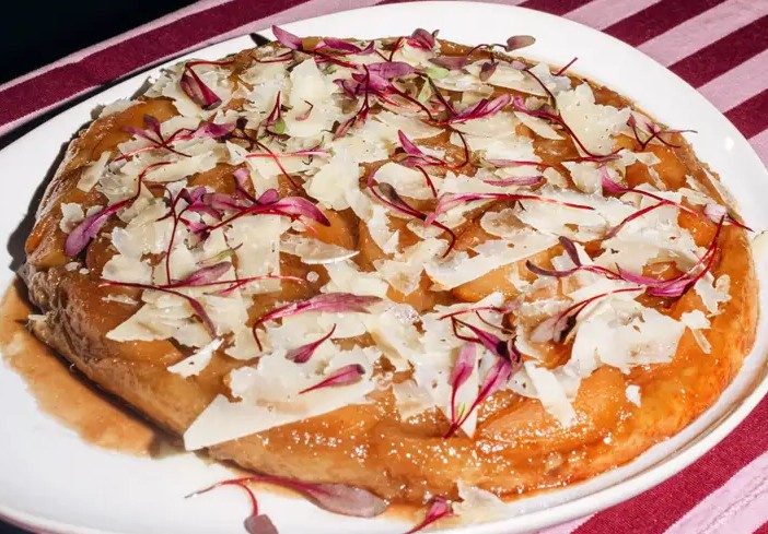 3、最后,在派的表面撒上一些刨好的芝士丝,再点缀上漂亮的迷你蔬菜叶,美味的焦糖苹果酥皮派就大功告成啦!赶紧趁热尝一口吧,感受这满满的甜蜜与幸福!