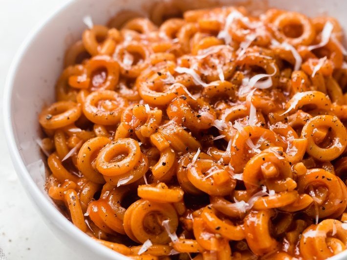 120克无盐黄油,分开用、2 瓣大蒜,切末、1 个洋葱,切碎、30克番茄酱、680克番茄泥、15克糖、10克盐,可按需再加、黑胡椒粉,适量、1 斤碎牛肉、500克意大利面或通心粉、180克磨碎的帕尔马干酪