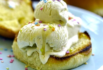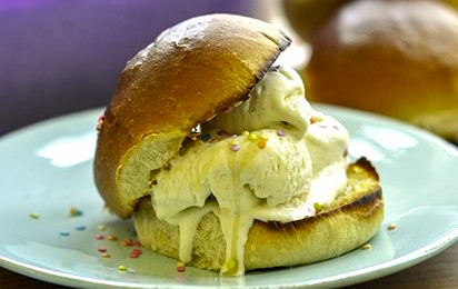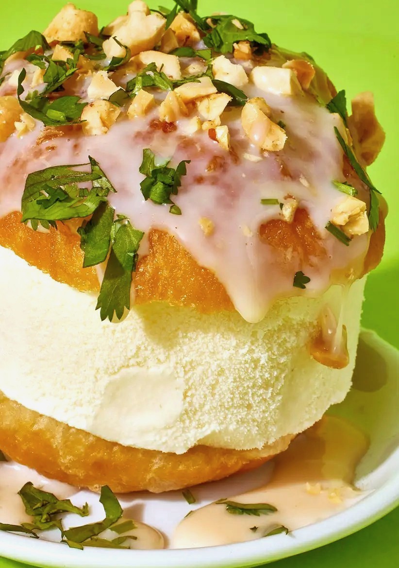 用锯齿刀把每个炸好的面包从中间切开,把一半的面包底放在小碗或大盘子里,每个上面舀一大勺香草冰淇淋,再盖上另一半面包,轻轻按压,做成冰淇淋三明治。最后在表面撒上花生碎、香菜叶、熟芝麻和海盐,淋上炼乳,就可以开吃啦!