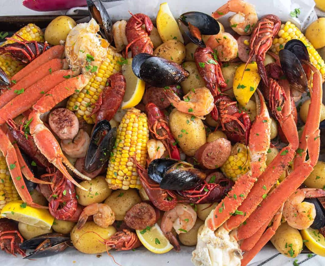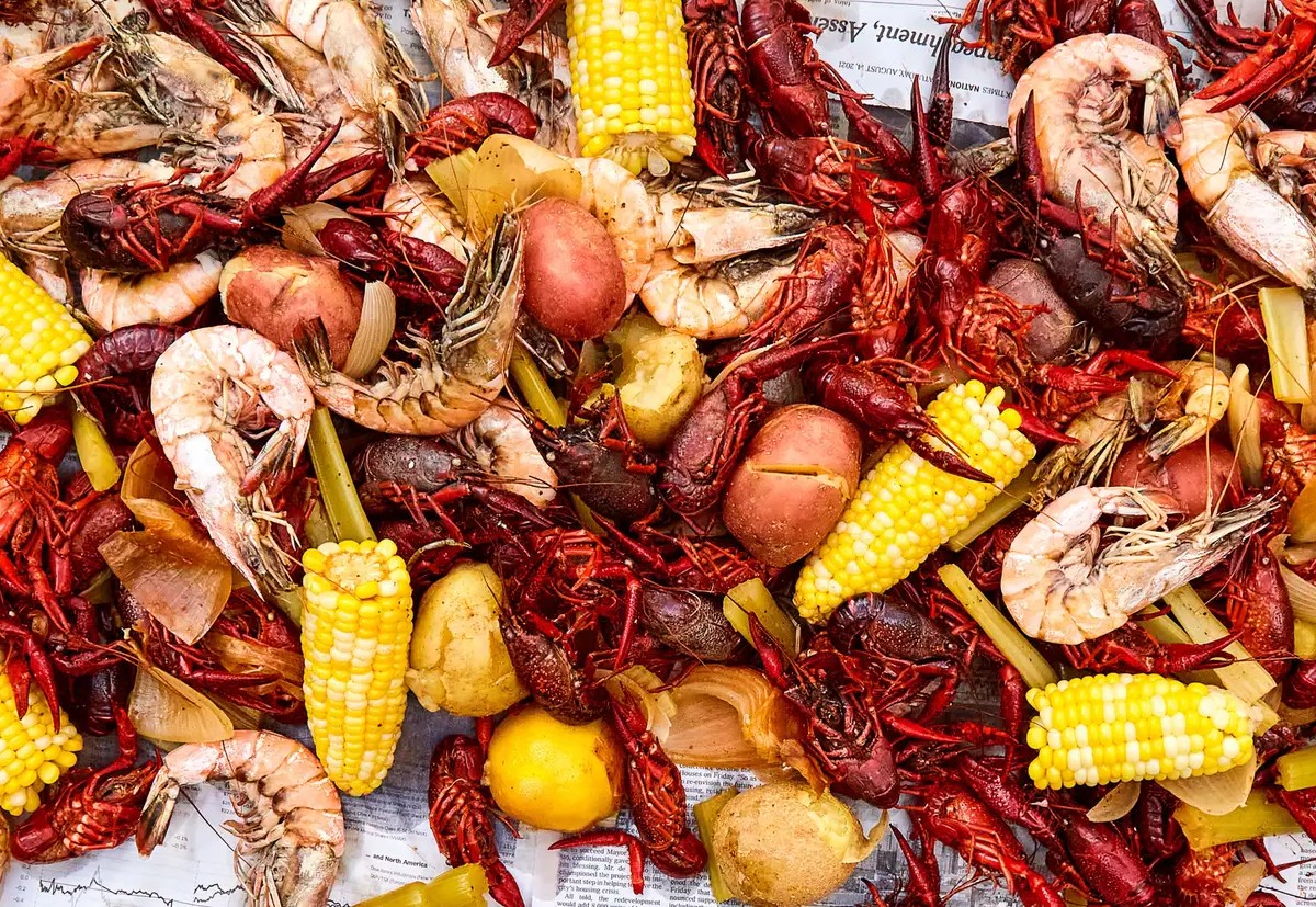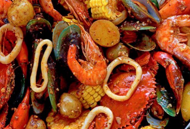 2、煮制食材:将空锅洗净,依次放入土豆、芹菜、洋葱、大蒜、柠檬、混合香料、生抽蚝油混合液、辣椒粉、剩余的食盐和水。开大火将水煮至沸腾,然后转中火煮到土豆刚刚熟透,大约十分钟。接着,把冷藏的小龙虾、虾和玉米放入锅中,盖上锅盖,继续煮 至海鲜完全熟透。