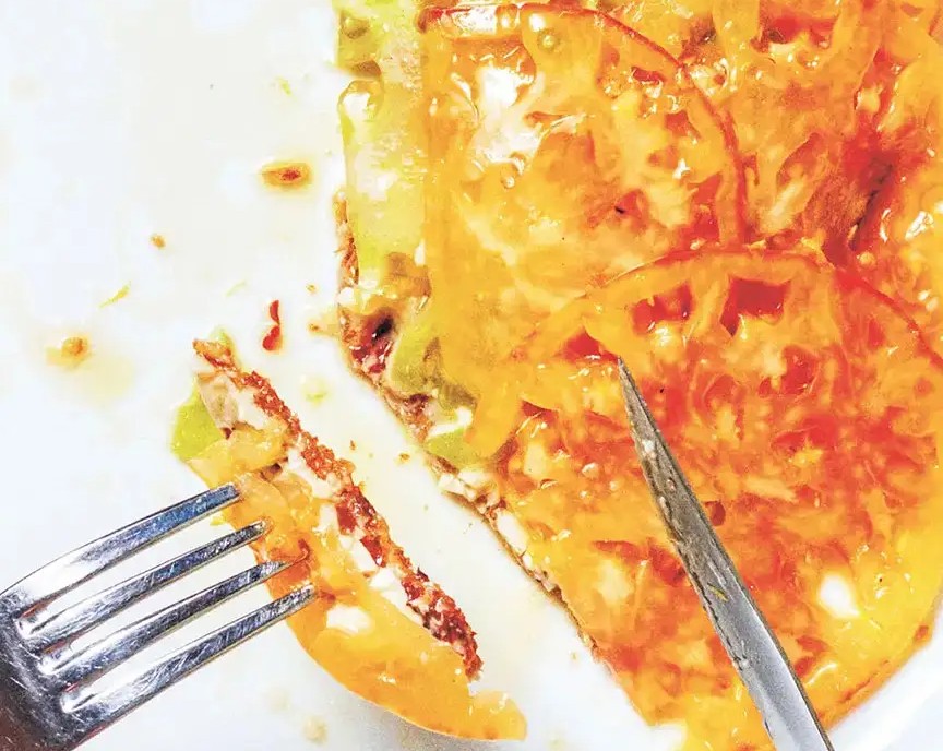 3、组装享用:把番茄片错落叠放在面包上,微微垂落的番茄片看着超有食欲!最后淋上剩下的橄榄油,这道高颜值的开放式番茄三明治就大功告成啦,记得现做现吃,口感最棒!