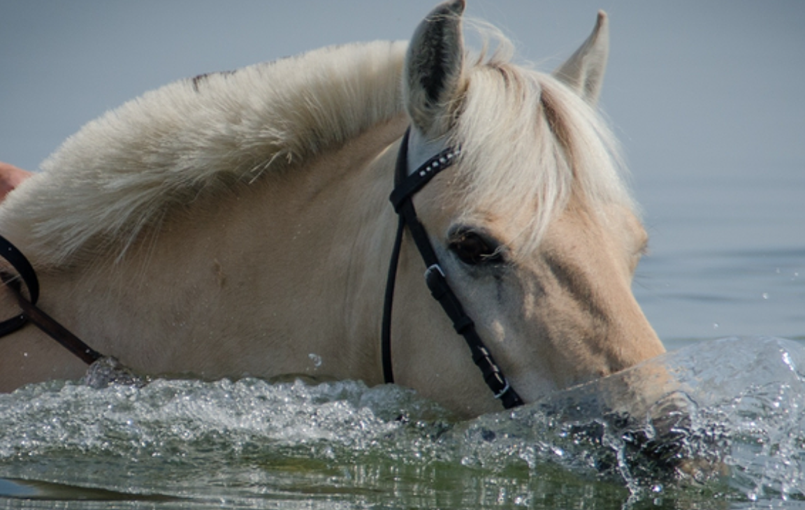 - 在浅水区活动:一开始别让马去太深的地方,等它在浅水区站得稳当了,再慢慢放开缰绳,让它试着游一小会儿,然后再回到浅水区。每次游泳的距离和时间慢慢增加。为了安全,我们自己要站在浅水区站稳,防止被马拽倒。牵缰绳的时候小心别被马的腿踢到。最好穿一双结实的旧靴子,万一被马踩到脚也不会太疼。