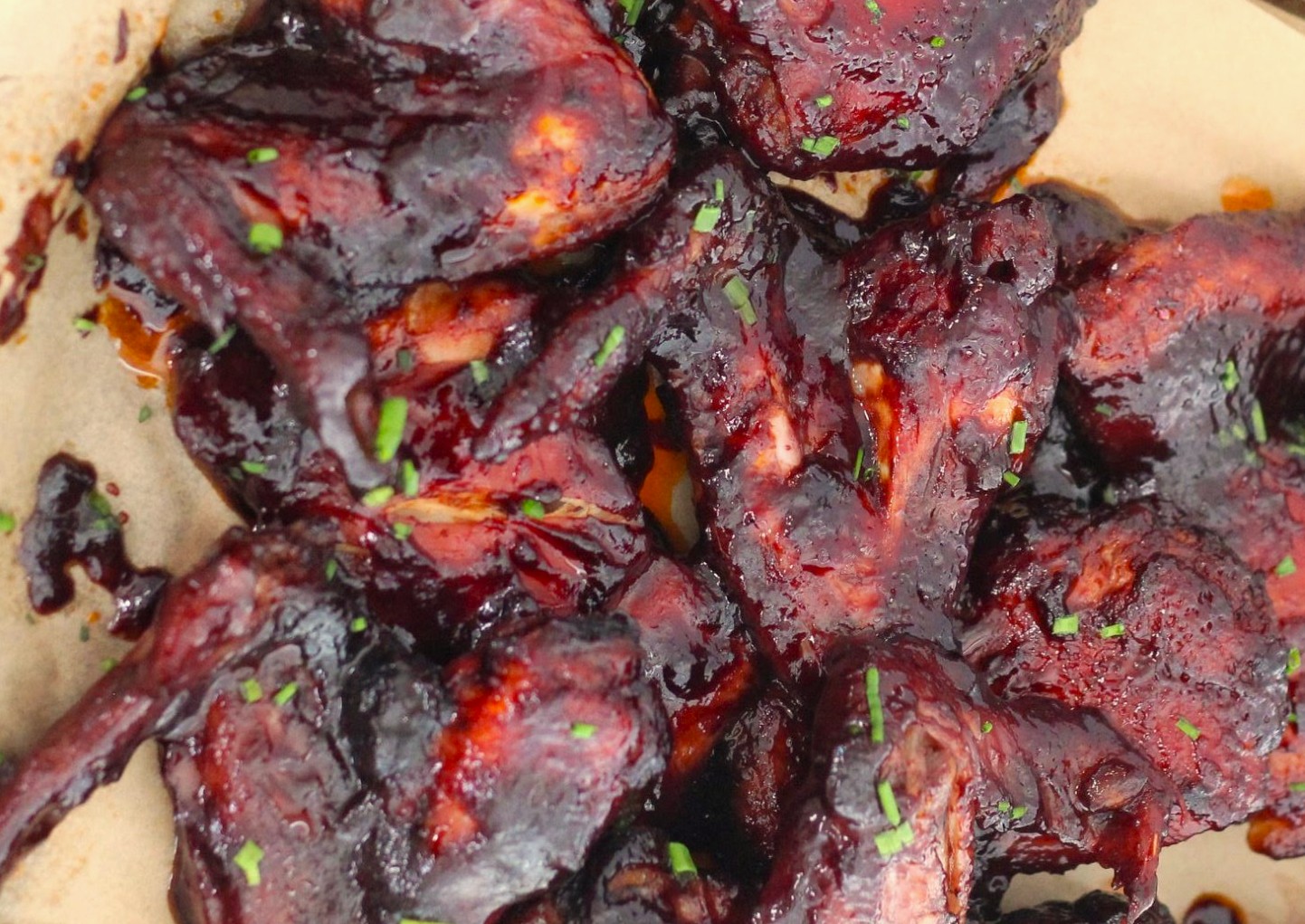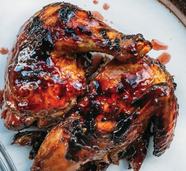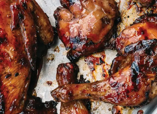 把鸡皮朝上放在烤架上,盖上盖子先烤 20 分钟,接下来每 5 分钟刷一次蓝莓酱,边刷边烤 20 分钟,每次刷完酱都要及时盖上盖子。然后用夹子小心翻面,继续每 5 分钟刷一次酱,直到鸡皮变得金黄酥脆。