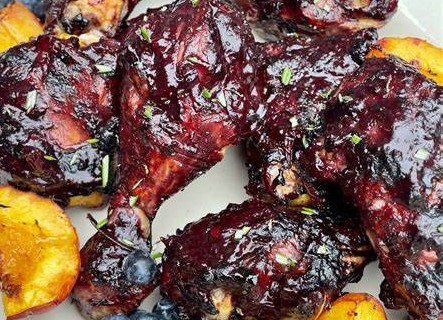 把烤好的鸡从烤架上取下,倒入杯蓝莓酱,让鸡肉充分裹满酱汁静置 10 分钟。然后把鸡肉切成块,再倒入剩余的蓝莓酱翻拌均匀。无论是趁热享用,还是等放凉了吃,都超级美味!