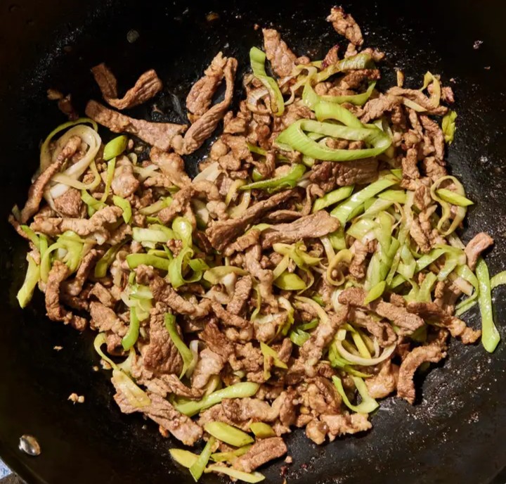 3、锅不用洗,再加入15毫升油,油热后把腌好的肉和剩下的蒜末一起倒进去。这时候手别停继续翻炒至肉条表面金黄微焦,香味扑鼻。