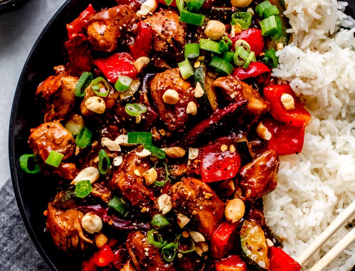 把炒锅烧到冒烟,倒入 3 大勺油,等油面微微泛起油纹时,迅速放入干辣椒、葱段、蒜片和姜末。干辣椒在热油中瞬间变得红亮,激发出浓郁的香气,这时立刻倒入腌制好的鸡肉丁。开大火快速翻炒,锅铲与铁锅碰撞出 “哗啦哗啦” 的响声,看着鸡肉丁在高温下逐渐变成诱人的金黄色。此时将调好的酱汁沿着锅边淋入,继续快速翻炒让酱汁紧紧包裹住鸡肉,等酱汁变得浓稠透亮就可以了。