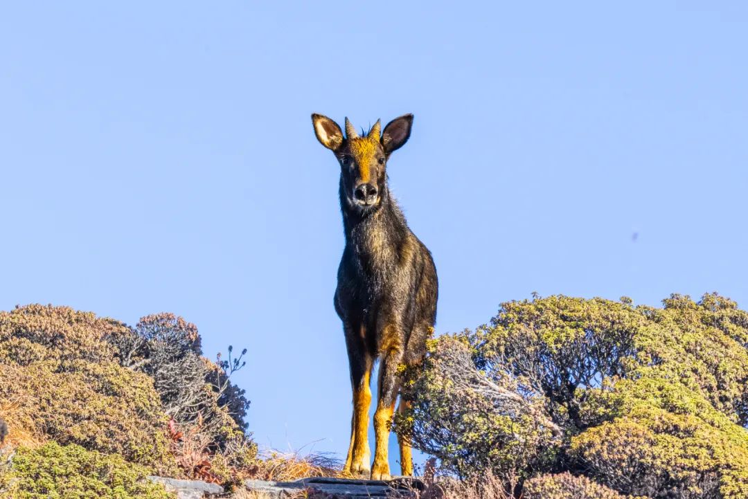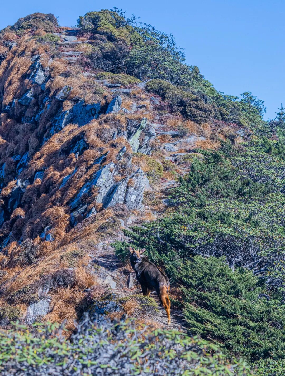 中华鬣羚在小岑峰徘徊2014年2月5日,摄影师张炜在苍山兰峰探访老朋友游隼时,意外在游隼常栖息的悬崖上邂逅了一只中华斑羚,并成功记录下它在岩石上晒太阳的珍贵瞬间。当时,他了解到苍山上还有一种更为神秘的动物——中华鬣羚(又称苏门羚),从此便对寻找这一珍稀物种念念不忘。同年6月4日,张炜在苍山海拔3300米的桃溪旁发现了一摊形似羊粪的粪便,经专家确认属于中华鬣羚。尽管他连续守候三天,却未能如愿见到这一神秘动物。十年后的2024年10月22日,张炜通过微友得知,有人在苍山龙泉峰脊上目击到疑似中华鬣羚的动物。随后,10月29日,另一位微友在中和峰拍摄到了中华鬣羚的照片。这一消息让张炜再次燃起了希望。10月30日,他毅然决定上山寻找。10月31日上午,经过不懈努力,张炜终于在苍山之巅、小岑峰和应乐峰之间的山脊上,成功拍摄到了这只中华鬣羚,圆了十年来的梦想。张炜描述,这只中华鬣羚体型肥硕、健壮,毛发油亮光滑,显示出苍山优越的生态环境为其提供了良好的生存条件。这一成果得益于过去十多年来苍山保护力度的加强,植被恢复良好,为中华鬣羚等野生动物提供了适宜的栖息地,同时猎杀行为也得到了有效遏制。