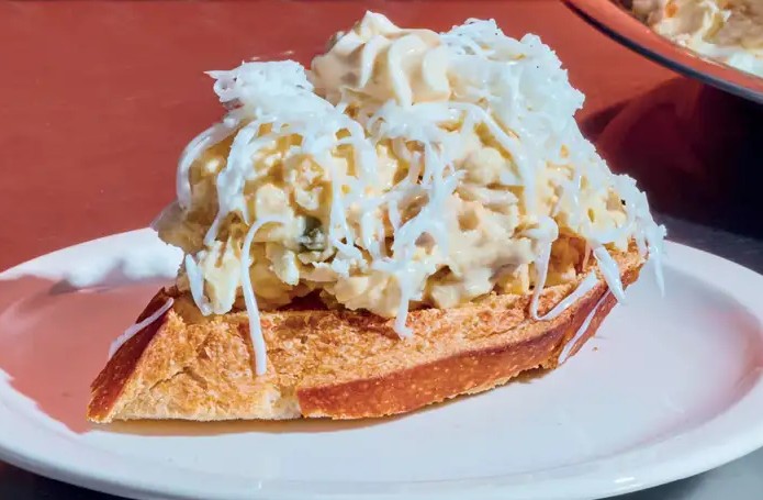 3、开吃时,用勺子舀一大勺沙拉,抹在法棍切片上并且用黄油刀堆成小山状。取出剩下 2 个鸡蛋的蛋黄,用擦丝器把蛋白擦成细丝,均匀撒在沙拉上。最后,用裱花袋在每片沙拉上挤一小勺蛋黄酱,这道超诱人的西班牙土豆沙拉小食就大功告成啦!快动手试试这道充满异域风情的美味小食吧!