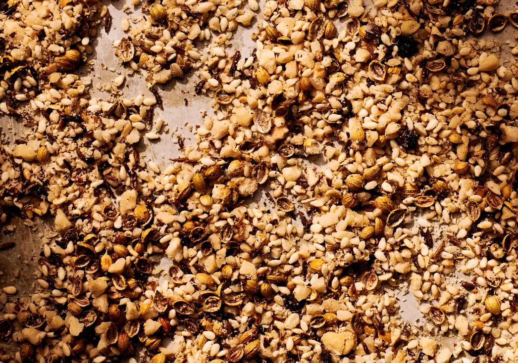 3、不用洗锅,接着把香菜籽和小茴香籽倒进去。随着翻炒,浓郁的香气渐渐飘出,大概 2 分钟,香料颜色变深,赶紧出锅,也放入料理机。等它们彻底晾凉,再加入碾碎的黑胡椒粒,启动料理机,断断续续搅打,直到变成粗粗的颗粒状,跟面包糠似的就大功告成。