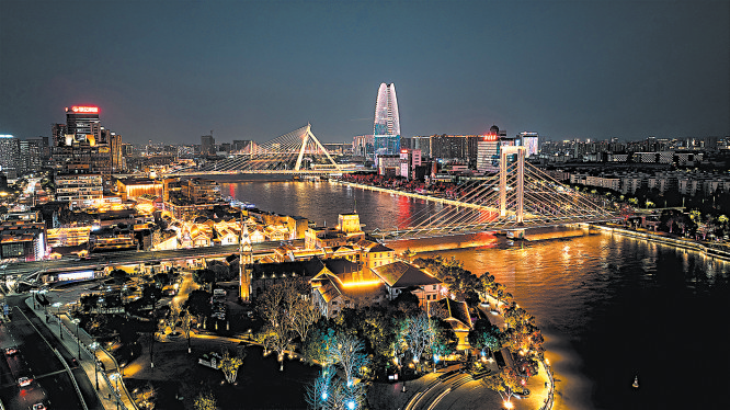 夜幕笼罩之时,江面上波光粼粼,船只往来,两岸灯光璀璨,勾勒出城市轮廓,构成一幅绝美夜景图。