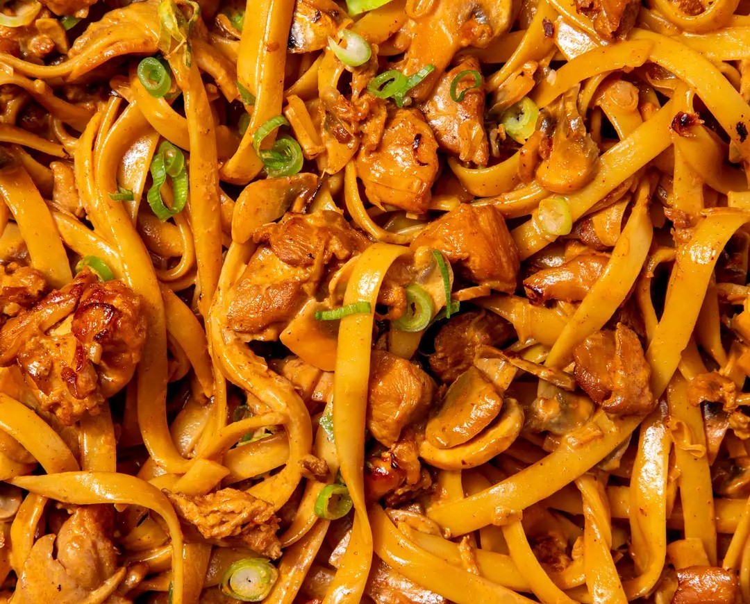 3、烹饪酱汁与组合:取一个干净的碗,将淡奶油、生抽和葱白丝倒进去,搅拌均匀。另起一口大平底锅,倒入剩下的 30 毫升食用油,开中火加热,等油热后放入腌制好的鸡肉快速翻炒,大概 3 分钟,鸡肉表面微微焦黄就可以了。接着加入蘑菇片,继续翻炒到蘑菇变软出汁,然后倒入调好的奶油酱汁,转小火慢炖 10 分钟,期间不时搅拌确保鸡肉完全熟透入味。放入煮好的意大利宽面,继续翻炒让酱汁浓稠地裹满每一根面条。如果觉得酱汁太干,就分次加入少量预留的面汤慢慢调节到满意的浓稠度。最后撒上葱绿丝,喜欢芝士的小伙伴此时可以加入芝士碎,翻拌均匀,一道香气四溢的韩式辣酱奶油鸡面就大功告成啦!