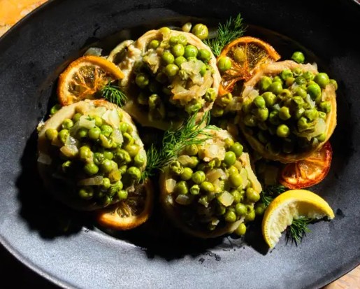 用铲子把洋蓟底部朝上摆在盘子里,留着锅中的汤汁。把炒好的豌豆铺在洋蓟上,撒上糖渍柠檬片,淋上之前留的汤汁,最后用茴香叶点缀一下,配上柠檬角,这道充满异域风情的美味就大功告成,快喊上家人朋友一起尝尝吧!
